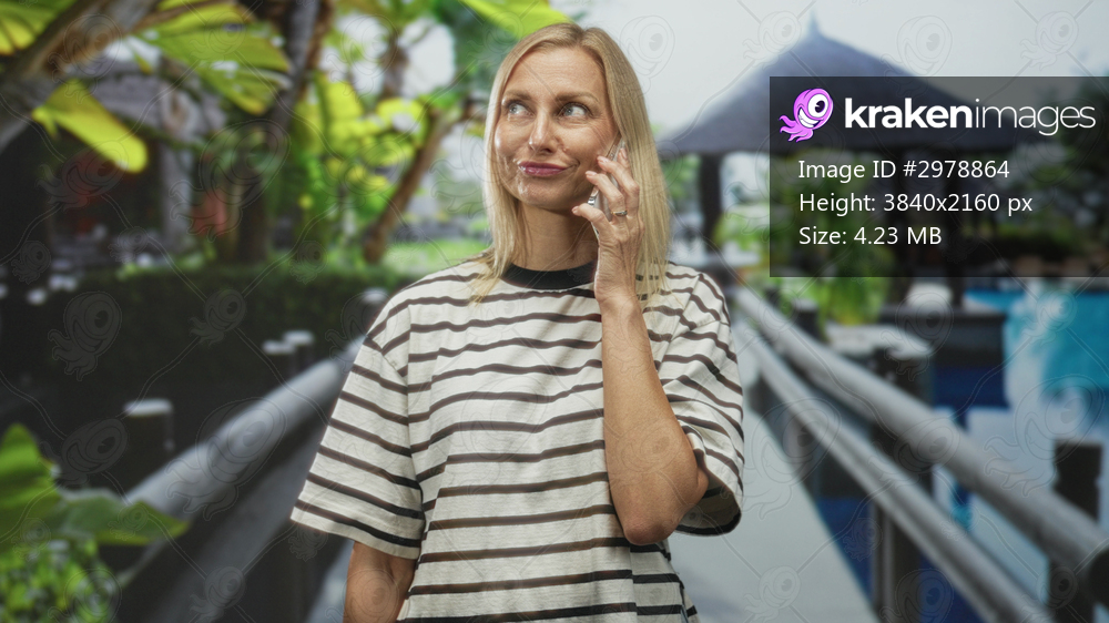 Woman holding smartphone to ear on resort pool walkway near gazebo building during phone call; quiet contemplation.