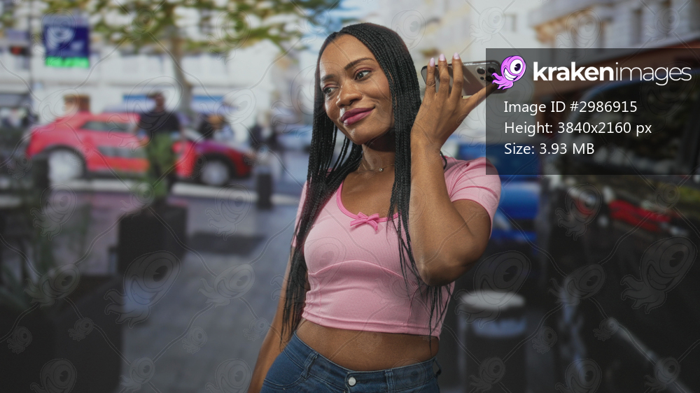 Woman holding smartphone to ear on street with pink crop top and exposed midriff; confidence ease casual charm.