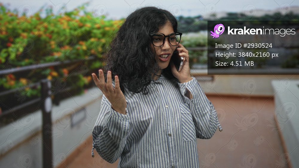 Woman holding smartphone to ear with raised hand gesture on building terrace, wearing glasses and striped shirt, curly dark hair visible; surprised engaged reaction. - Kraken Images