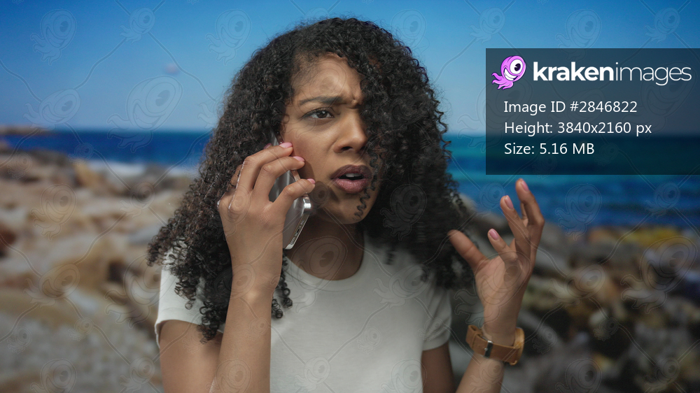 Woman holding smartphone to ear and showing tense hand at street by rocky beach outdoors; frustration.