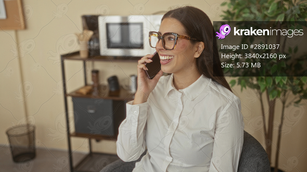 Woman holding smartphone to ear smiling while seated in a building office chair; friendly work happiness.