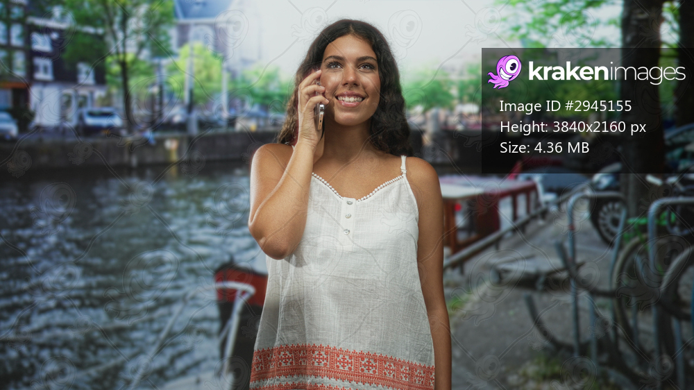Woman holding smartphone to ear, smiling while standing beside a canal with bicycles and boats on a street; contentment connection leisure.