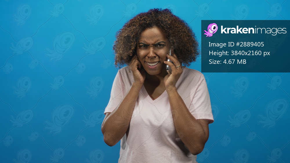 Woman holding smartphone to ear and touching cheek in blue studio wearing pink shirt; discomfort frustration.