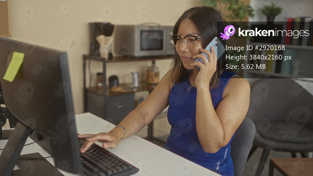 Woman holding smartphone to ear and typing on keyboard at white desk in office building; focused productivity.