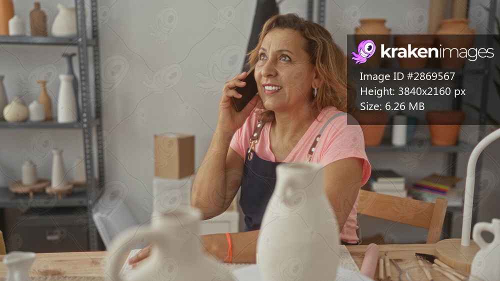 Woman holding smartphone to ear while seated at a pottery table surrounded by ceramic vases in studio; creative passion.