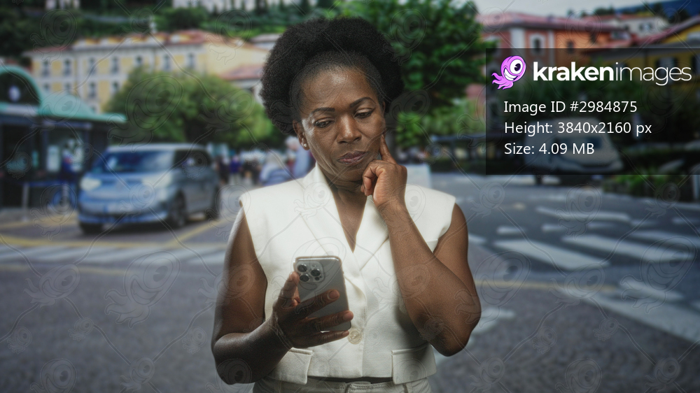 Woman holding smartphone and touching cheek with finger while checking screen on street; contemplation focus thoughtful.