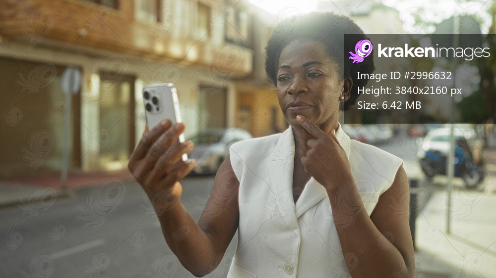 Woman holding smartphone and touching chin on a city street with buildings and parked cars, gesturing during a video call; thoughtful connection.