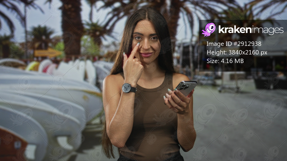 Woman holding smartphone and touching under eye with finger by surfboards and palm trees on street; playful curiosity.