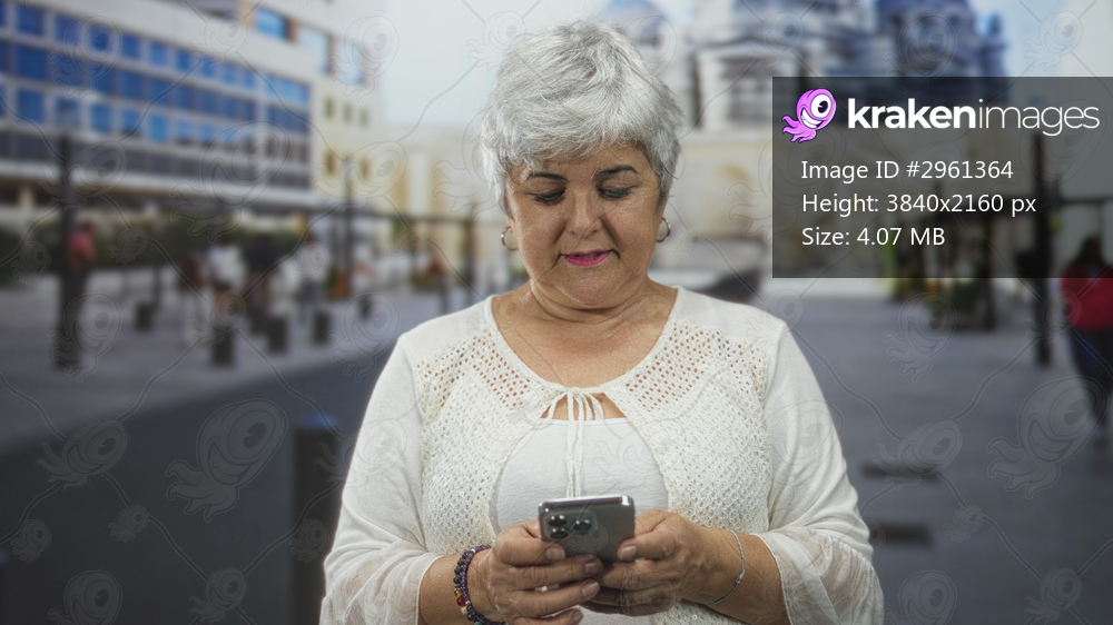 Woman holding smartphone and typing with both hands on a pedestrian street near modern buildings and bollards; calm focus.