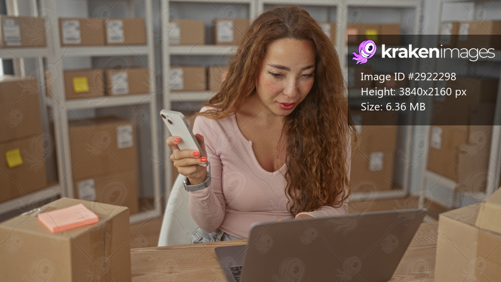 Woman holding smartphone and typing on laptop among parcels and shelving in a building office; small business determination.