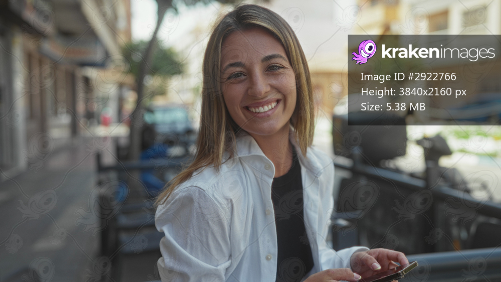 Woman holding smartphone, typing and smiling on a city street terrace near a scooter and railing; digital connection contentment.