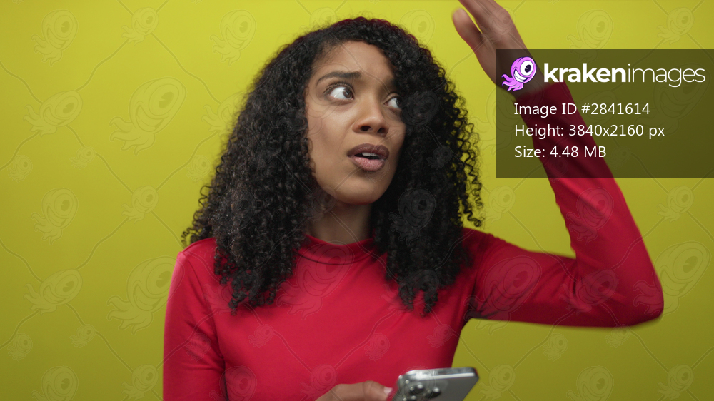 Woman holding smartphone and typing with thumb on screen against yellow background in studio; concentration.