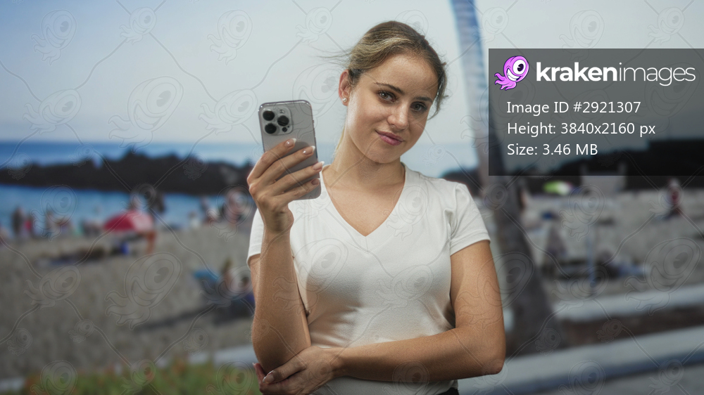 Woman holding smartphone up and looking to the side on a sunny beach boardwalk, raised hand visible and other arm crossed across waist; contemplation.