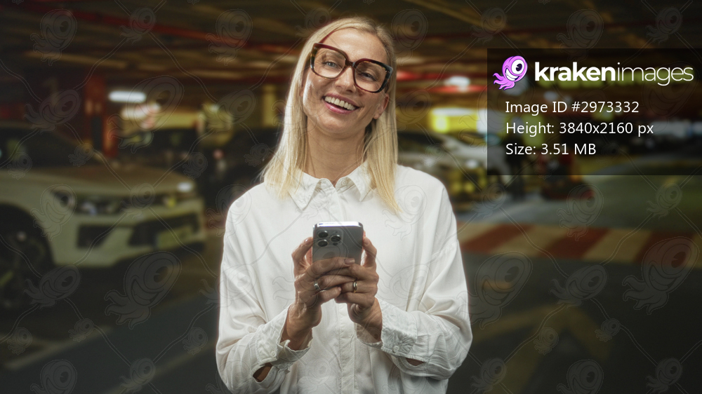 Woman holding smartphone with visible hands, smiling while looking at screen in airport parking terminal near parked cars and signage; contentment travel ease. - Kraken Images