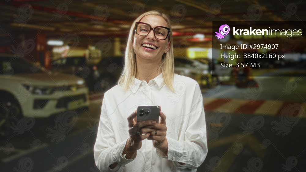 Woman holding smartphone with visible hands, smiling while looking at screen in airport parking terminal near parked cars and signage; contentment travel ease. - Kraken Images