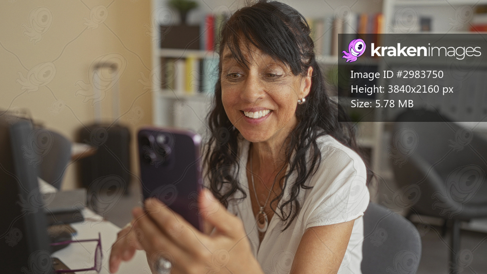 Woman holding smartphone waves hand and smiles during a call at a desk in a building office space; virtual family joy.