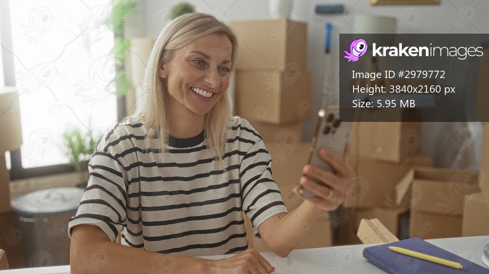 Woman holding smartphone, waving hand and smiling amid packed moving boxes in building; joy connection.