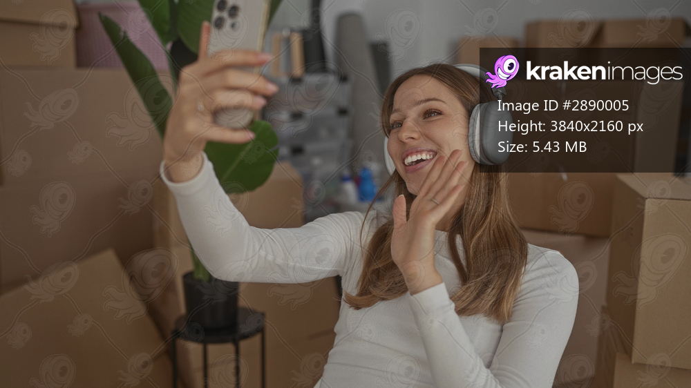 Woman holding smartphone waving inside building surrounded by moving boxes; joy new home celebration.