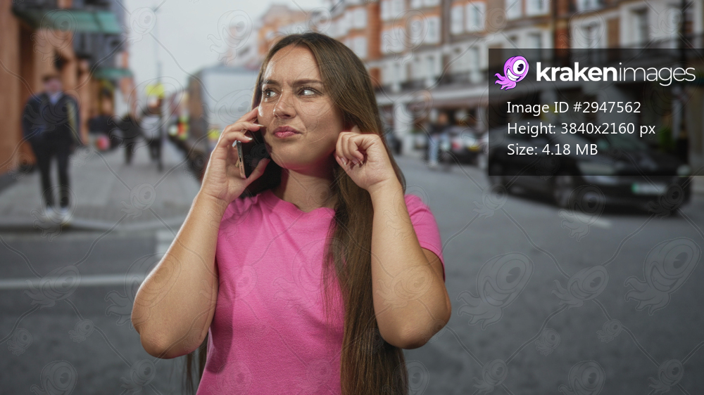 Woman holding smartphone while covering ears with fingers on a busy city street, grimacing and wincing from loud noise; annoyance noise.