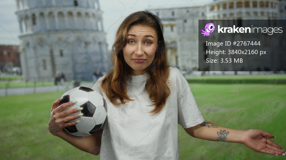 Woman holding soccer ball at pisa tower, italy, showcasing a playful expression against a vibrant outdoor backdrop during daytime