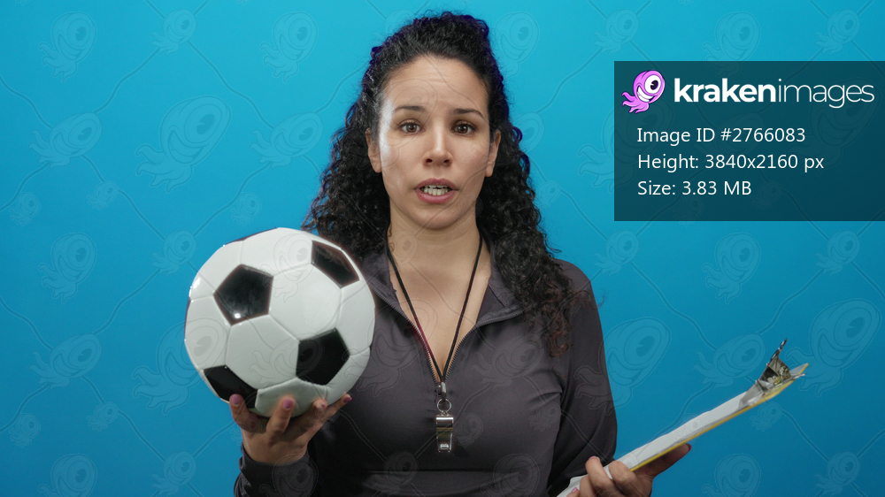 Woman holding soccer ball and clipboard against blue wall, wearing whistle, representing sports coaching, isolated background, female, hispanic, young, expressive, confident.