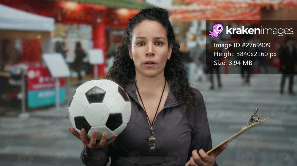 Woman holding soccer ball and clipboard on busy street with colorful market background, wearing whistle and casual clothing, conveying urban sports coaching. - Kraken Images