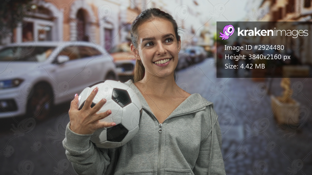 Woman holding soccer ball with hand on a cobbled street near parked cars and buildings; youthful joy.