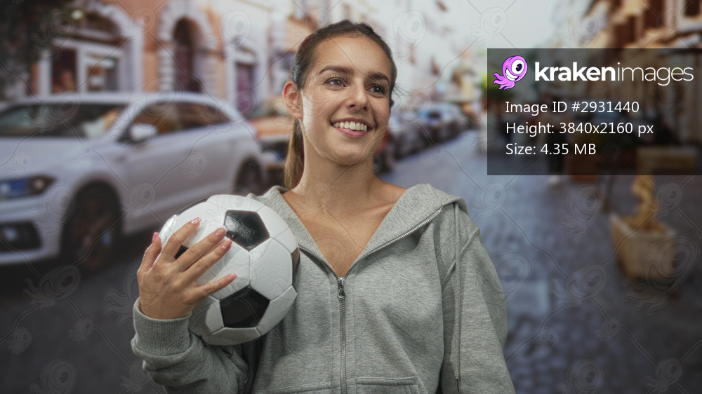 Woman holding soccer ball with hand on a cobbled street near parked cars and buildings; youthful joy.