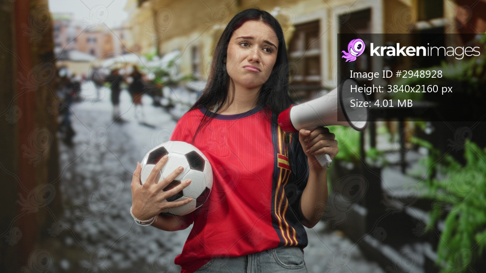 Woman holding soccer ball and megaphone with a sad expression on street; disappointment team support loyalty.