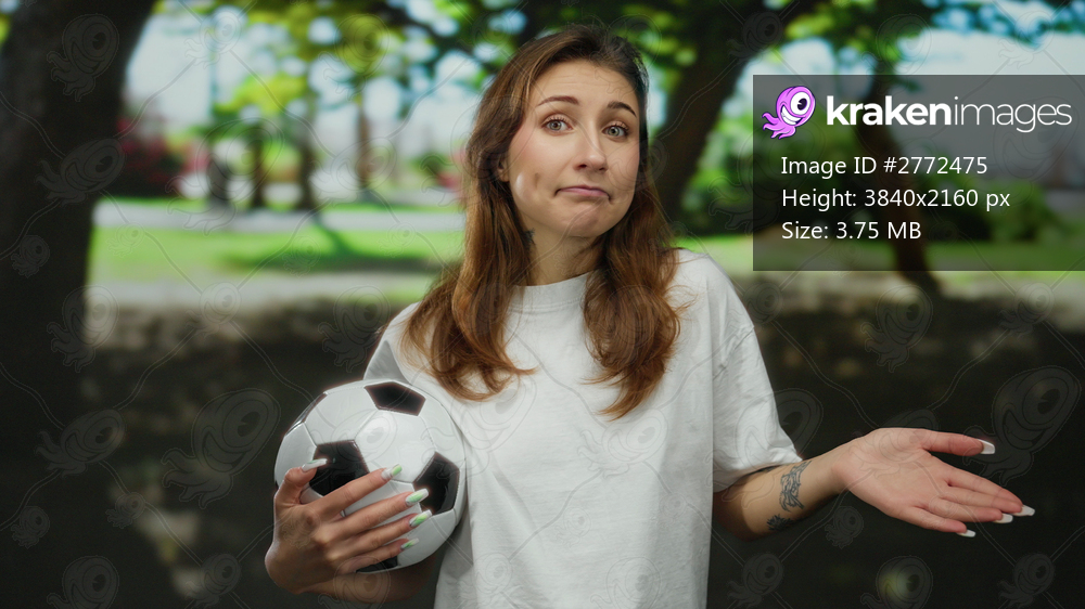 Woman holding soccer ball outdoors in sunny park setting showing playful expression amid lush green surroundings reflecting a carefree outdoor leisure moment.
