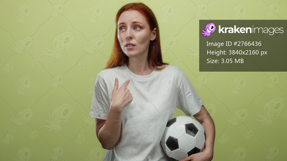 Woman holding soccer ball with perplexed expression against a yellow wall, featuring red hair and casual white shirt on an isolated background.