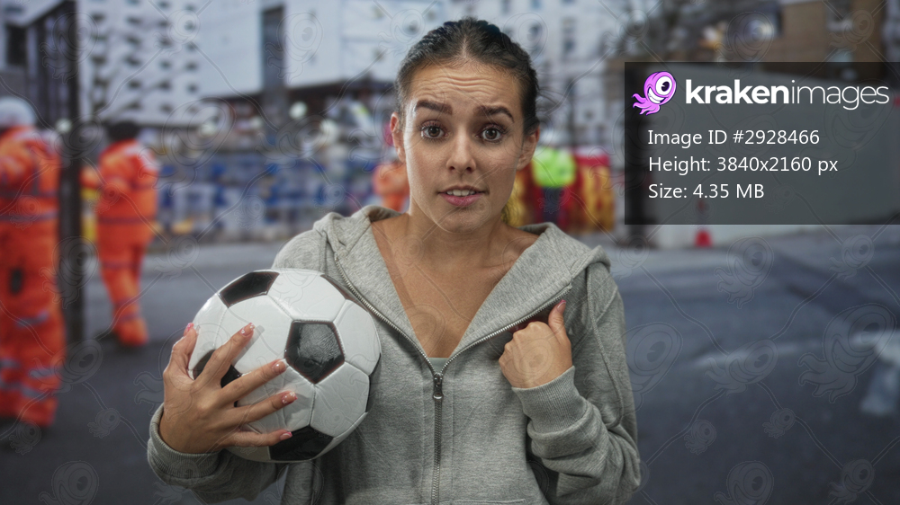 Woman holding soccer ball and pointing finger to chest in front of building construction; confidence casual sport.