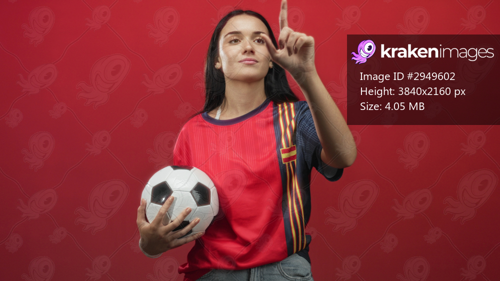 Woman holding soccer ball, pointing index finger, wearing spanish team jersey in studio; pride celebration.