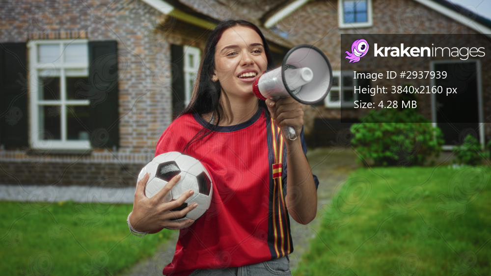 Woman holding soccer ball and shouting into megaphone in front of building, wearing red striped jersey and standing on lawn; enthusiasm support.