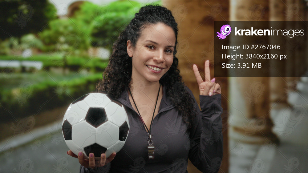 Woman holding soccer ball and showing peace sign in park with lush greenery and stone columns in background, radiating happiness and enthusiasm outdoors. - Kraken Images