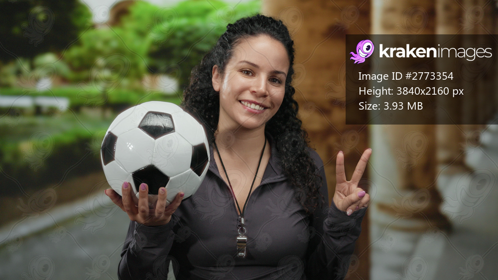 Woman holding soccer ball and showing peace sign in park with lush greenery and stone columns in background, radiating happiness and enthusiasm outdoors. - Kraken Images