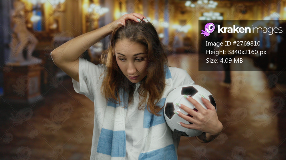 Woman holding soccer ball with surprised expression inside museum surrounded by ornate decor and warm lighting.