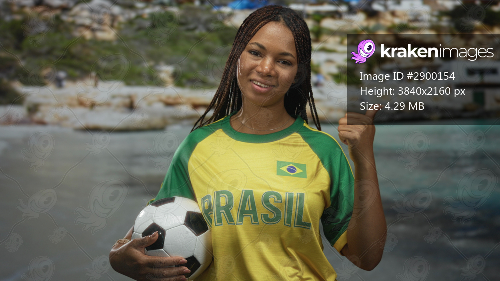 Woman holding soccer ball with thumb up by seaside building, wearing brazil jersey with visible flag and braided hair, smiling at camera; team pride.