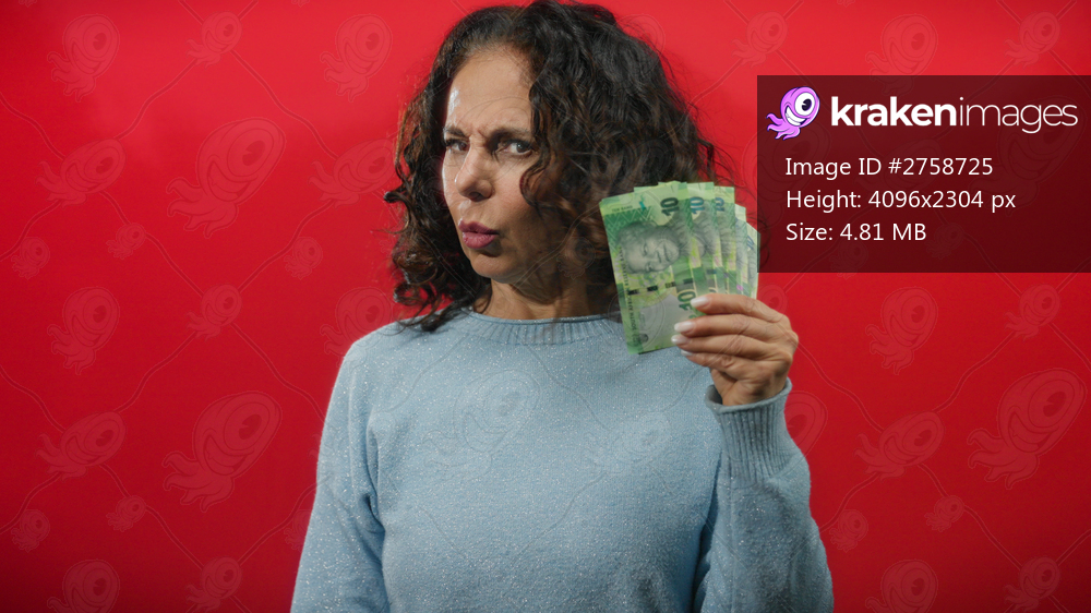 Woman holding south african banknotes against red wall, appearing concerned, conveying financial stress or confusion, middle-aged with curly hair wearing a light blue sweater. - Kraken Images