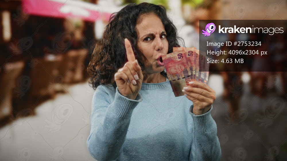 Woman holding south african rand, gesturing no with finger on city street, conveying disagreement or frustration in an outdoor setting.