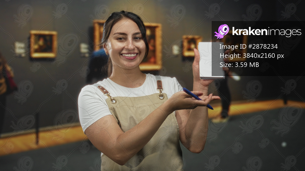 Woman holding spiral notebook and blue pen while smiling and presenting a blank page in a building art gallery; cheerful curiosity learning.