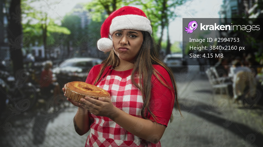 Woman holding sponge cake and grimacing on a street wearing a santa hat and apron; holiday frustration.