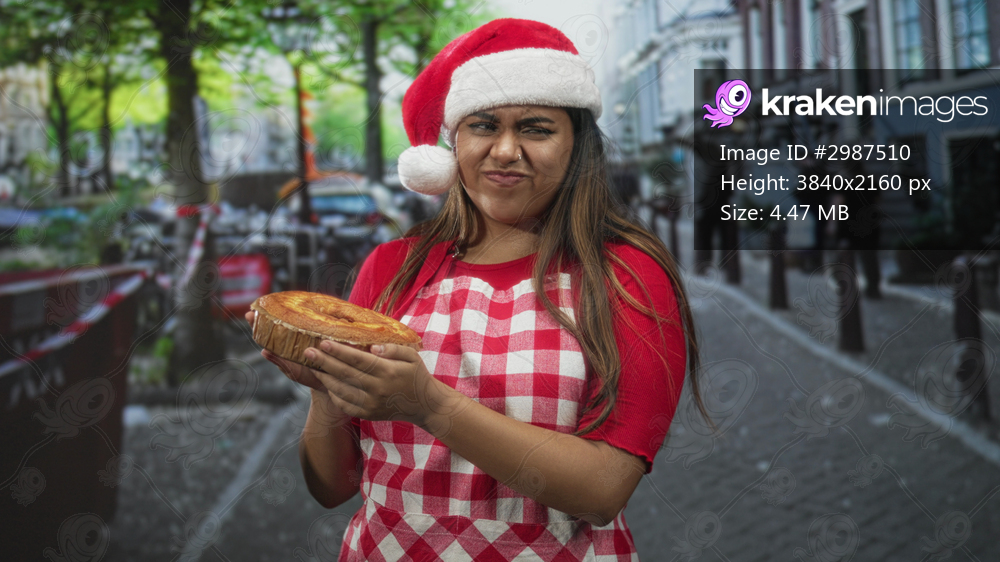 Woman holding sponge cake with hands on a cobbled street in a santa hat and red checked apron, grimacing while inspecting the pastry; holiday discomfort. - Kraken Images