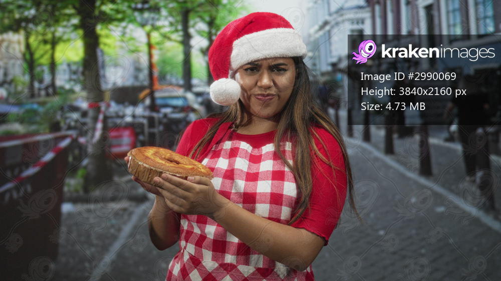 Woman holding sponge cake with hands on a cobbled street in a santa hat and red checked apron, grimacing while inspecting the pastry; holiday discomfort. - Kraken Images