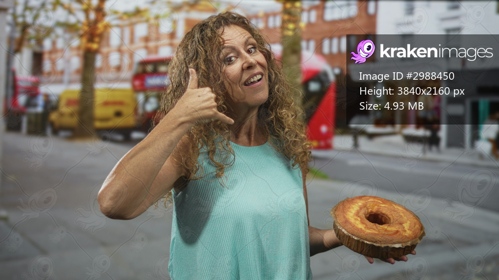Woman holding sponge cake and showing call gesture on city street near bakery storefront; playful invitation.