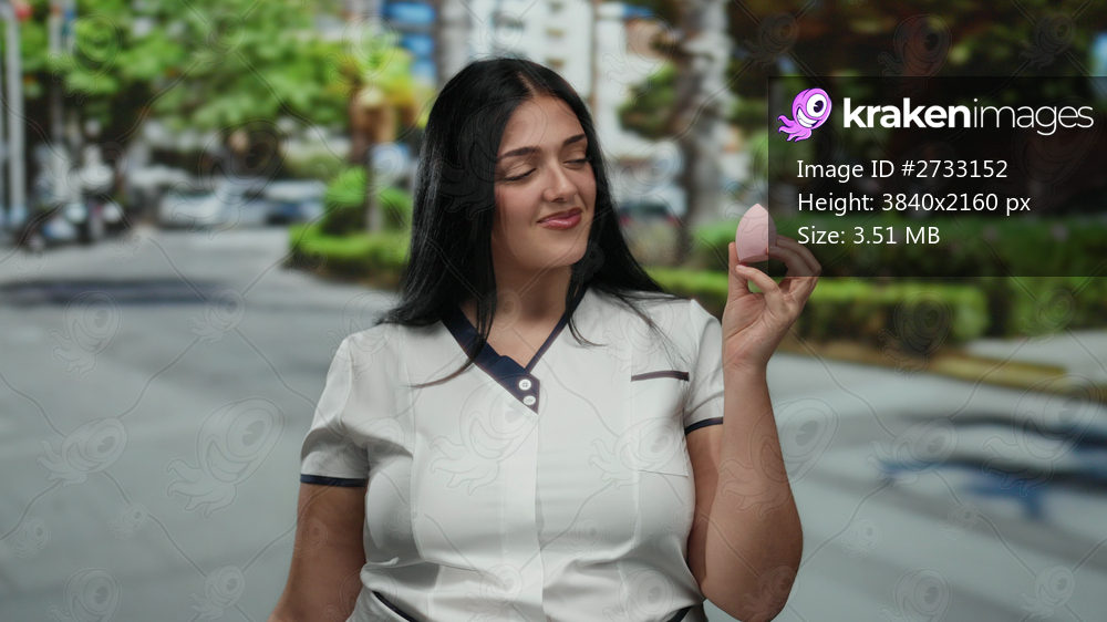 Woman holding sponge standing outdoors on city street, showcasing plus size beauty with makeup accessory in urban environment.