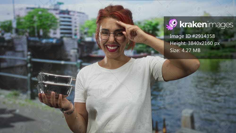Woman holding stacked aluminum food containers and raising two fingers in street by a canal bridge in amsterdam; happiness sharing.