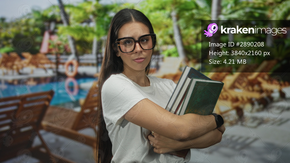 Woman holding stacked books with arms crossed, wearing glasses, standing by a pool next to lounge chairs in a hotel building; contemplation.