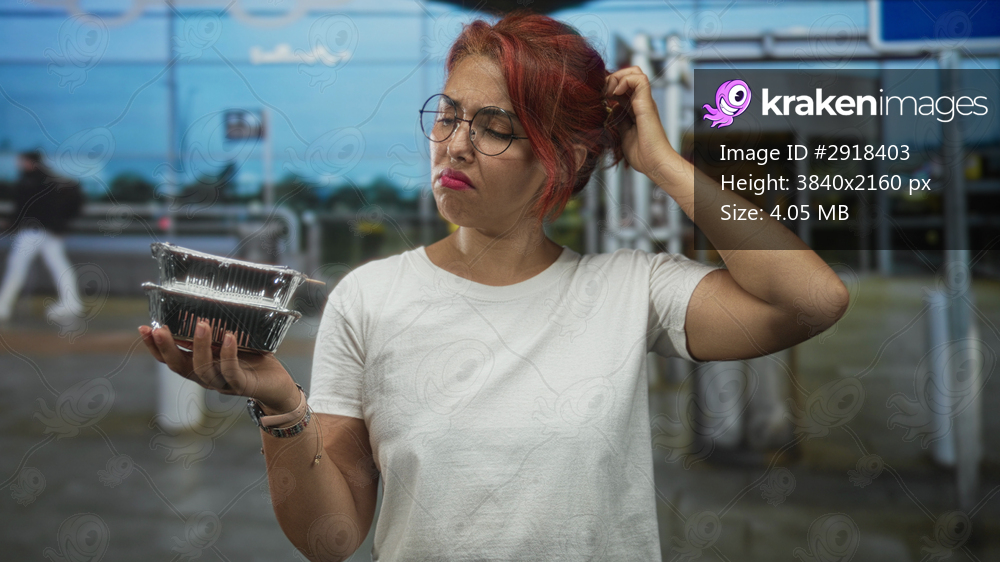 Woman holding stacked foil food containers, scratching head at airport terminal; frustration travel inconvenience.