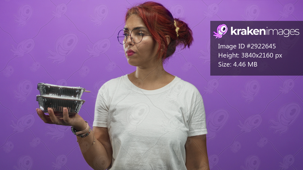 Woman holding stacked foil takeout containers in a purple studio, palm up and looking aside, red hair tied back wearing round glasses and white tee; quiet contemplation. - Kraken Images